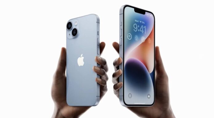 وعرضت شركة آبل هاتفي “آيفون 14” و”آيفون 14 بلاس”، مع وجود جهاز “آيفون” بلون أرجواني”.