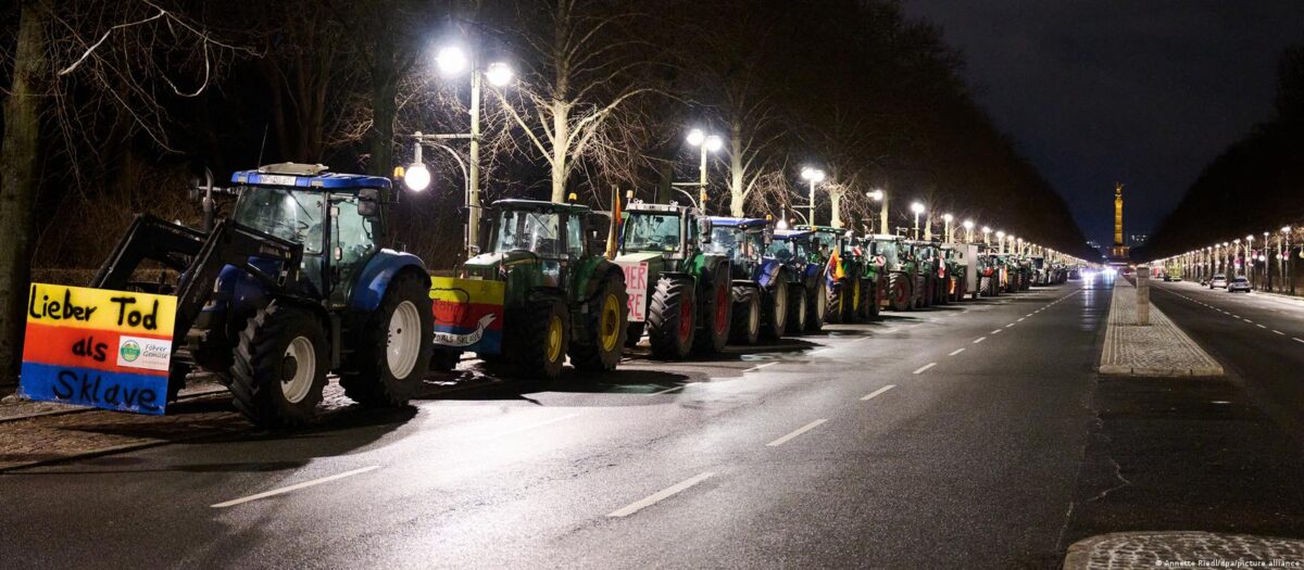 ويحتج المزارعون الألمان على إصلاح الضرائب على الديزل الزراعي، والذي ينصّ على إلغاء الإعفاء الذي استفاد منه المزارعون، بحلول العام 2026، إذ لم تؤد فترة مفاوضات بين النقابات والحكومة إلى التوصل إلى حل.