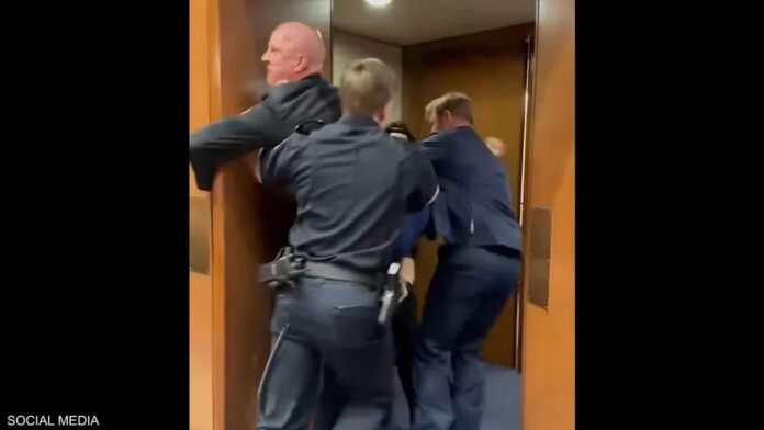 وأظهر فيديو المتداول ثلاثة من ضباط الشرطة وهم يحاولون إخراج ماكغينيس، الذي يرشح نفسه عن “حزب الخضر” لمجلس الشيوخ عن ولاية كارولاينا الشمالية، وانضم إليهم السيناتور الجمهوري تيم شيهي لمساعدة الضباط في إخراج المحتج. أثناء المشادة، بقي ماكغينيس ممسكًا بالباب، ما استدعى تدخل أحد الضباط لتحرير يده.