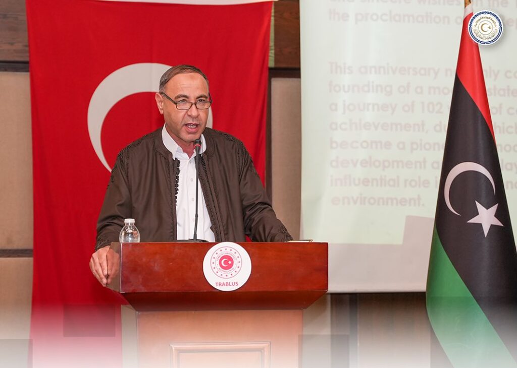 وألقى الباعور كلمة خلال الحفل، نقل في مستهلها – نيابة عن حكومة الوحدة الوطنية والشعب الليبي – أطيب التهاني وأصدق الأمنيات إلى فخامة الرئيس رجب طيب أردوغان، وإلى الحكومة والشعب التركي الصديق، بهذه المناسبة الوطنية التي تجسد مسيرة حافلة بالإنجاز والتنمية امتدت لأكثر من قرن، تمكنت خلالها تركيا من أن تصبح نموذجاً رائداً في التنمية ودولة فاعلة ومؤثرة في محيطها الإقليمي والدولي.