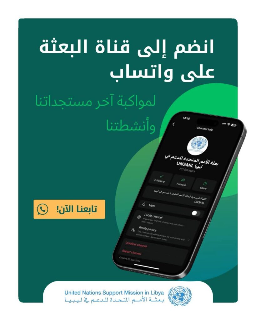 أطلقت بَعثة الأمم المتحدة للدعم في ليبيا، قناة خاصة على تطبيق واتساب، “حرصًا على إبقاء الجمهور على اطلاع دائم بأحدث المستجدات والأنشطة المتعلقة بالبعثة”.