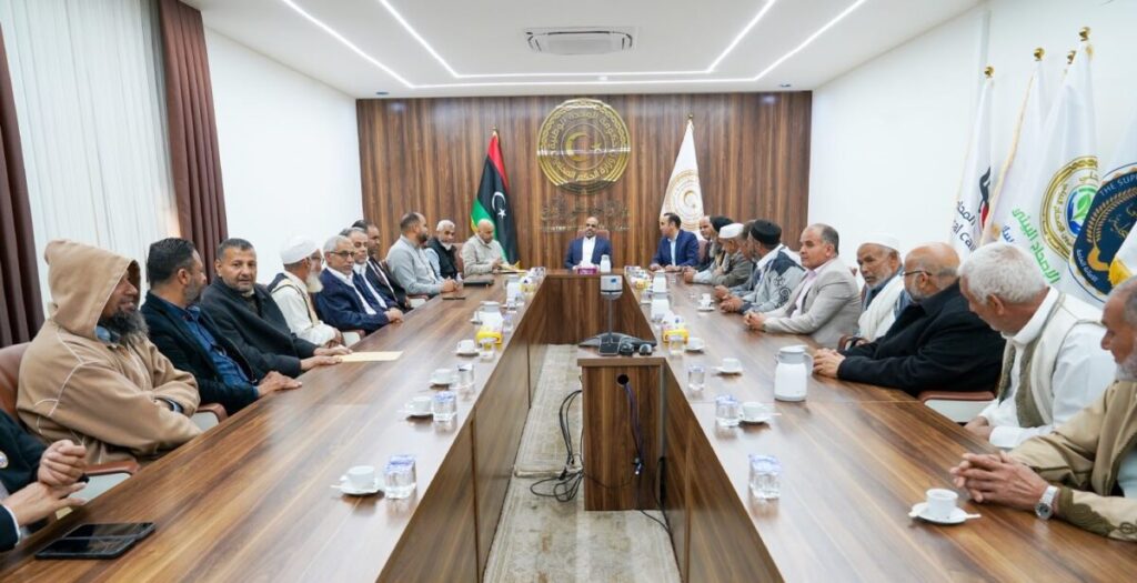 بحث وزير الحكم المحلي عبد الشفيع الجويفي مع وفد من أعضاء وأعيان وحكماء بلدية قصر الأخيار سبل معالجة الأوضاع الإدارية داخل البلدية، وذلك خلال لقاء عقد الخميس 9 أبريل 2026 في مقر ديوان الوزارة بالعاصمة طرابلس.