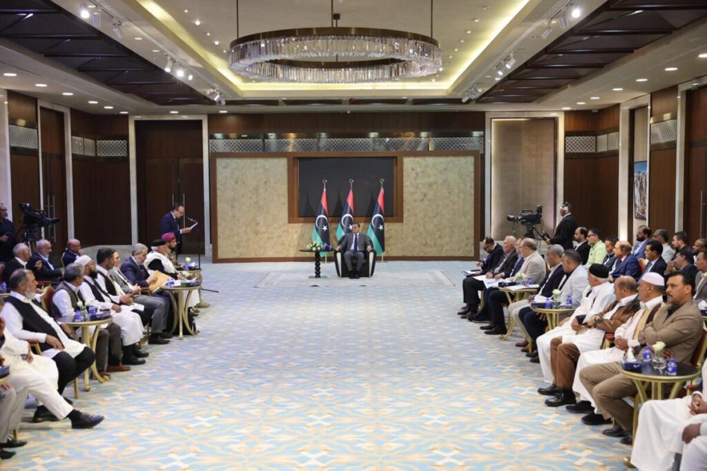 التقى رئيس حكومة الوحدة الوطنية عبد الحميد الدبيبة اليوم الثلاثاء، بمجمع قاعات غابة النصر في طرابلس مجلس حكماء وأعيان وعميد بلدية ترهونة خلال اجتماع خُصّص لمتابعة أوضاع المدينة وتسريع وتيرة المشروعات الخدمية والتنموية.