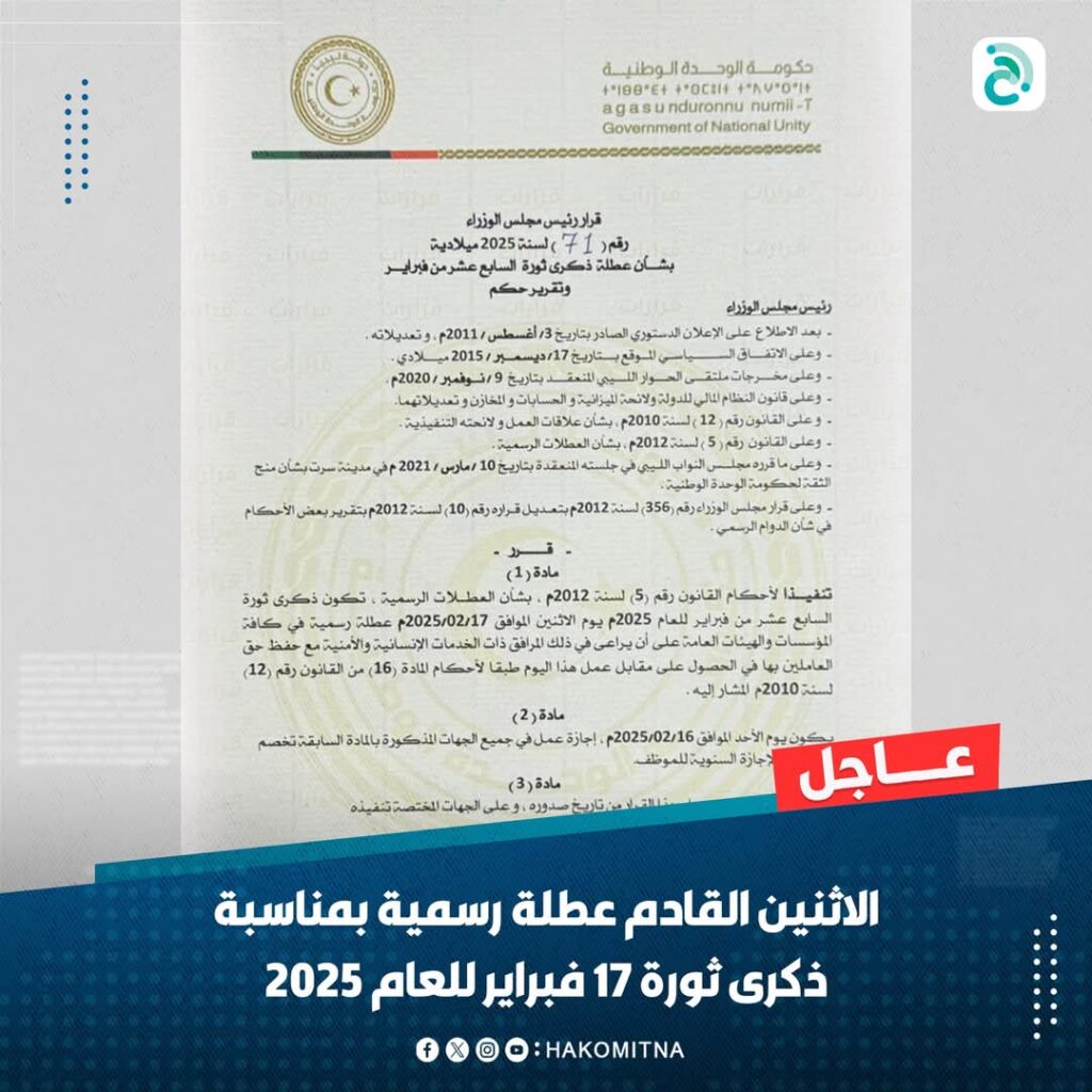 وجاء في القرار: “تنفيذا لأحكام القانون رقم (5) لسنة 2012م ، بشأن العطلات الرسمية، تكون ذكرى ثورة السابع عشر من فبراير للعام 2025م يوم الاثنين الموافق 2025/02/17م عطلة رسمية في كافة المؤسسات والهيئات العامة على أن يراعى في ذلك المرافق ذات الخدمات الإنسانية والأمنية مع حفظ حق العاملين بها في الحصول على مقابل عمل هذا اليوم طبقا لأحكام المادة (16) من القانون رقم (12) لسنة 2010م المشار إليه”.