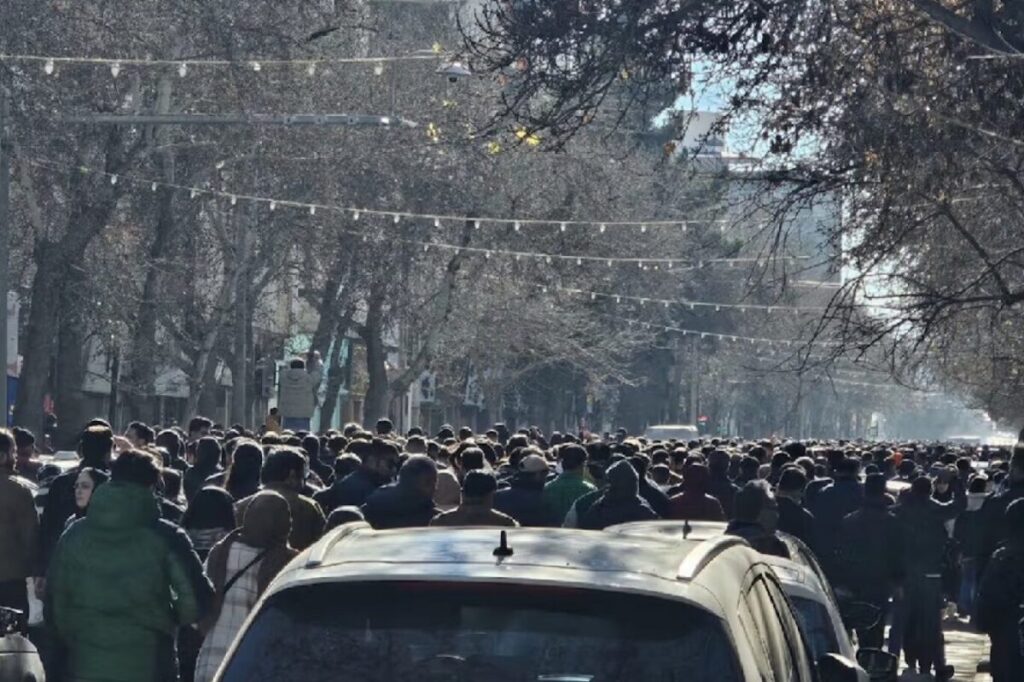 وأظهرت مقاطع أخرى متظاهرين يحملون لافتات كُتبت عليها عبارات استغاثة بخط اليد، من بينها: “لا تدعهم يقتلوننا”، بينما دوّت هتافات مناهضة للنظام في شوارع متفرقة من العاصمة ومدن أخرى، وسط أجواء مشحونة بالتوتر.