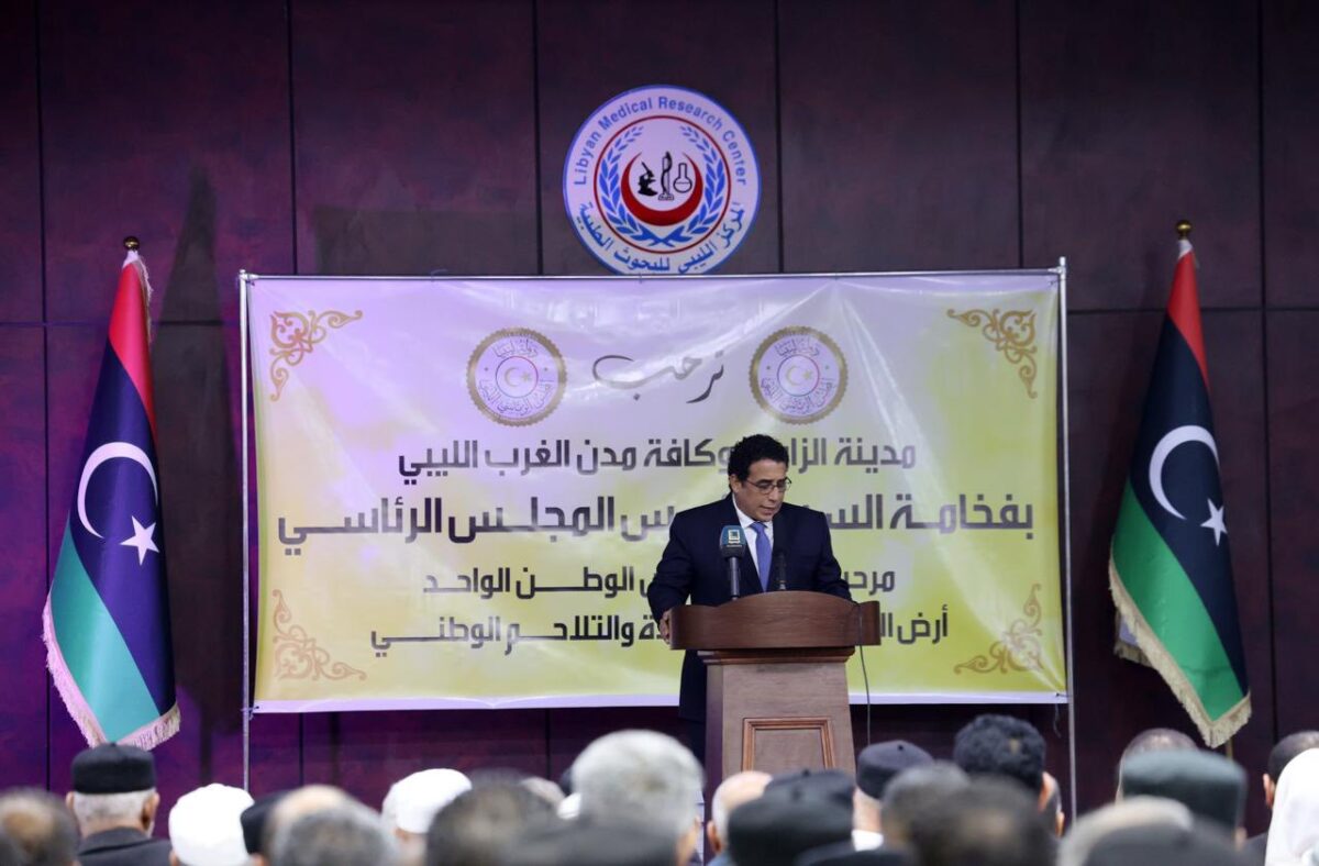 وفي كلمته، شدد الرئيس محمد المنفي على المكانة الوطنية الراسخة لمدينة الزاوية ومناطق الساحل والجبل الغربي، ودورها الفاعل في دعم مسار المصالحة الوطنية الشاملة، الهادفة إلى رأب الصدع وجمع الشمل وتوحيد الصف، مؤكدًا أن ليبيا انطلاقًا من هذه الحاضرة العريقة ما زالت تؤمن بالحوار نهجًا، وبالتلاقي سبيلًا، وبالشراكة أساسًا لرسم مستقبل الأجيال القادمة، مستلهمين في ذلك تضحيات الآباء والأجداد في مواجهة الاستعمار وصناعة الاستقلال ورفع راية الوطن موحدة.