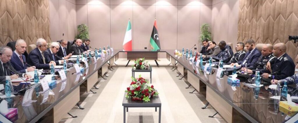 عقد وزير الداخلية المكلف بحكومة الوحدة الوطنية، اللواء عماد مصطفى الطرابلسي، اليوم الاثنين، اجتماعًا مع وزير الداخلية الإيطالي، ماتّيو بيانتيدوسي، بحضور الوفد المرافق وعدد من قيادات وزارة الداخلية الليبية، وذلك في إطار تعزيز التعاون الثنائي بين البلدين.