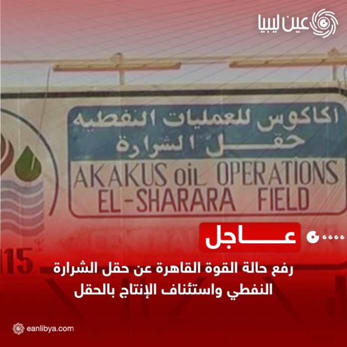 The post المؤسسة الوطنية للنفط تُعلن رفع حالة القوة القاهرة عن حقل الشرارة واستئناف الإنتاج appeared first on عين ليبيا آخر أخبار ليبيا.