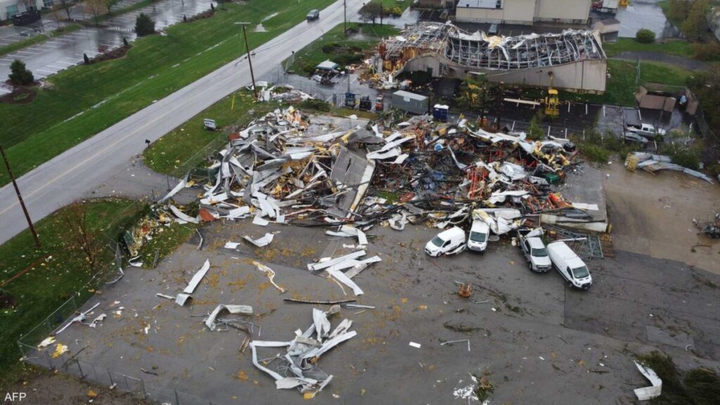 ووفق وكالة “فرانس برس”، “في جيفرسونتاون في كنتاكي، دُمّرت مبان عدة جرّاء إعصار واقتلعت الأشجار وقطعت خطوط الكهرباء وانقلبت سيارات”.