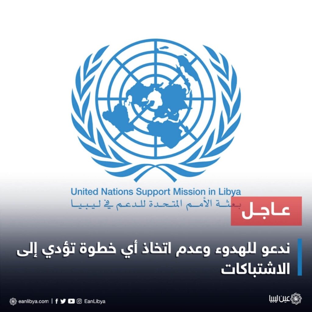 بعثة الأمم المتحدة للدعم في ليبيا: نشدد على على أهمية الحفاظ على الهدوء والاستقرار في البلاد والامتناع عن أي عمل يؤدي إلى اشتباكات مسلحة، ونطالب الأطراف بالتعاون مع “ستيفاني وليامز” من أجل إيجاد طريق إلى تسوية سياسية للأزمة الحاصلة.