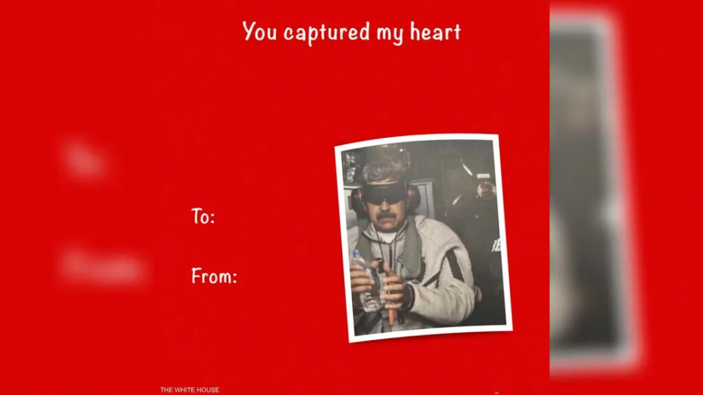 في خطوة غير مسبوقة وملفتة للأنظار، نشر البيت الأبيض، بمناسبة عيد الحب، مجموعة بطاقات وميمات سياسية ساخرة وعالية الجرأة، أبرزها رسالة مباشرة من الرئيس الأميركي دونالد ترامب إلى الرئيس الفنزويلي نيكولاس مادورو تحت عنوان: “لقد أسرت قلبي”.