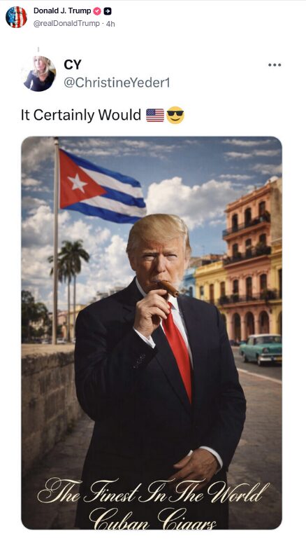 وعلّق ترامب على الصورة بالقول: “الأفضل في العالم السيجار الكوبي”، رغم أن ترامب لا يدخن في الواقع.