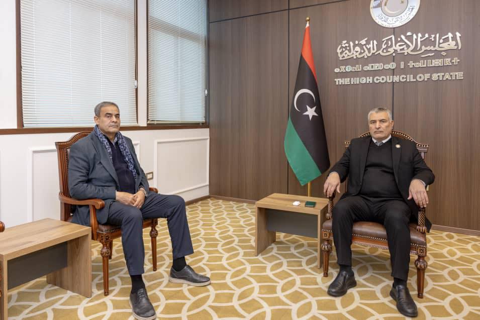 استقبل رئيس المجلس الأعلى للدولة محمد تكالة، اليوم الاثنين 12 يناير، وزير المواصلات والمستشار المالي لرئيس حكومة الوحدة الوطنية محمد الشهوبي، وذلك بمقر المجلس في العاصمة طرابلس.