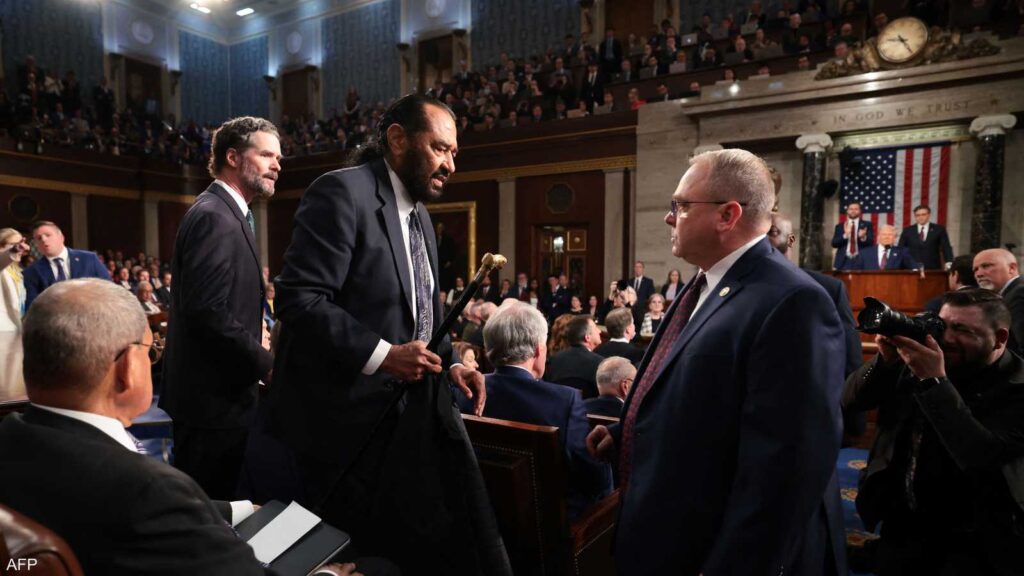 وبحسب “فرانس برس”، “ما أن بدأ “ترامب” بإلقاء خطابه حتى انبرى عدد من البرلمانيين الديموقراطيين إلى إطلاق صيحات استهجان لمقاطعته، وعندما تواصلت هذه الصيحات هدّد رئيس مجلس النواب بإخراج مطلقيها من القاعة إذا لم يكفّوا عنها، فرفض النائب من ولاية تكساس “آل غرين” الاستجابة ووقف رافعا عصاه وصاح بوجه الملياردير الجمهوري ليعمد عندها موظفو الكونغرس إلى مرافقة المشرّع إلى خارج قاعة مجلس النواب أمام ناظري “ترامب”.