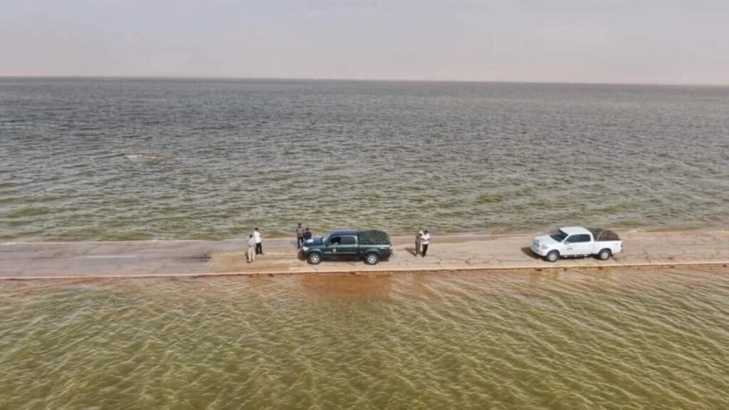 The post طريق المخيلي الصحراوي يتحوّل إلى بحيرة.. وسدّ وادي جازا يُفرّغ من المياه appeared first on عين ليبيا آخر أخبار ليبيا.