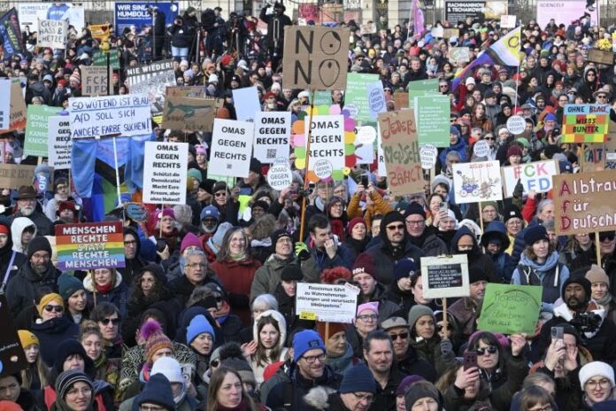 رفضا لحكم اليمين المتطرف، وقبل أسبوع من موعد إجراء الانتخابات التشريعية، تظاهر أكثر من 30 ألف شخص تظاهروا في برلين ضد القوى اليمينية، بعدما أطلق نائب الرئيس الأميركي جي دي فانس، دعوة للأحزاب الألمانية حيث طالبها بفتح الباب أمام اليمين المتطرف”.