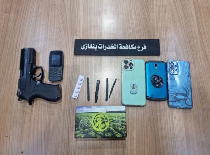 تمكن أعضاء فرع جهاز مكافحة المخدرات والمؤثرات العقلية في بنغازي من إلقاء القبض على شخص ليبي الجنسية بعد تنفيذ كمين محكم. وجرى ضبط المتهم، الذي يُدعى “م. ع. ع”، من مواليد 1997، ويقيم في منطقة بوصنيب، وهو موظف عام، وبحوزته كمية من المواد المخدرة وأسلحة نارية.