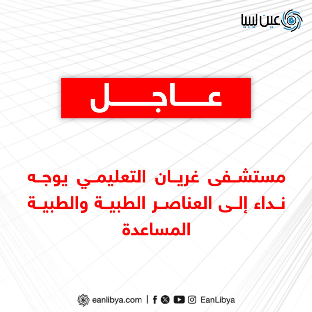 The post مستشفى #غريان التعليمي يوجه نداء إلى العناصر الطبية والطبية المساعدة بضرورة سرعة التوجه إلى المستشفى على خلفية الاشتباكات التي تشهدها المدينة appeared first on عين ليبيا آخر أخبار ليبيا.