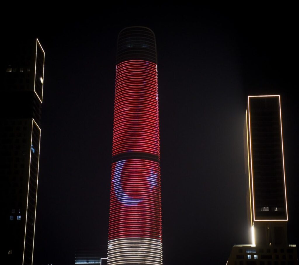 أضيء البرج الأيقوني في العاصمة الإدارية الجديدة بمصر بألوان علم تركيا، مساء الأربعاء، احتفالا بمرور 100 عام على تأسيس العلاقات الدبلوماسية بين البلدين.