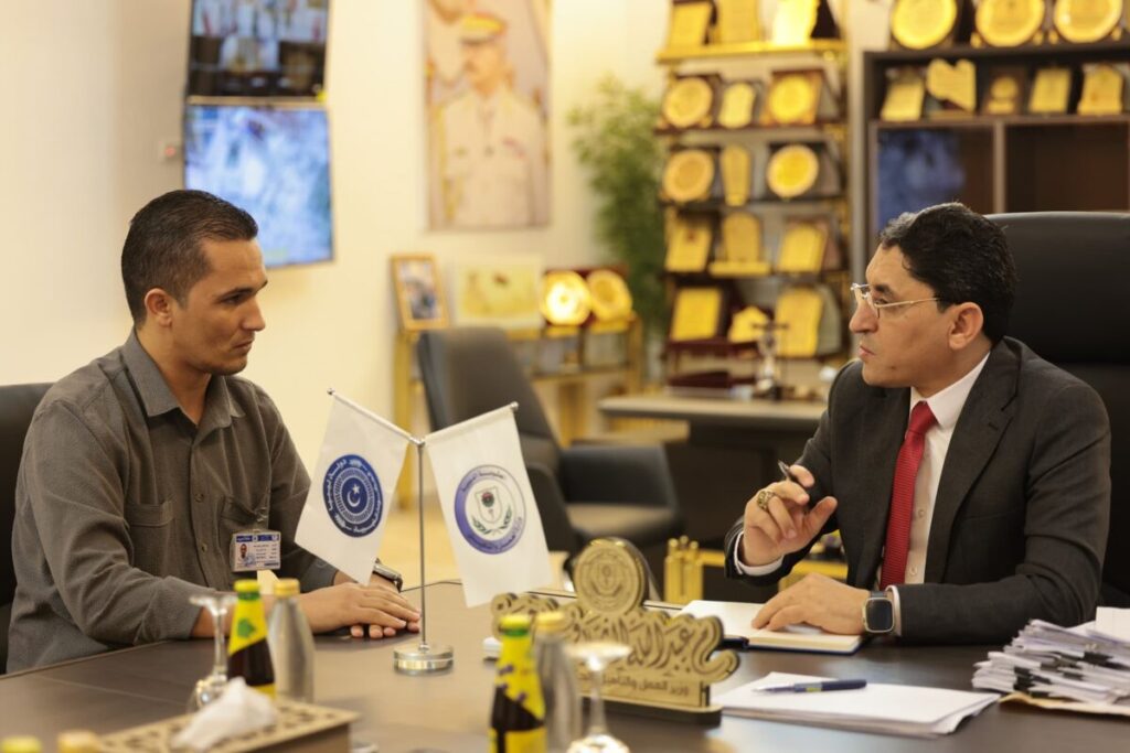 في إطار سعي وزارة العمل والتأهيل بحكومة الوحدة الوطنية، المستمر لتطوير قدرات موظفيها وتعزيز أدائهم المهني، عقد وزير العمل والتأهيل، عبدالله الشارف أرحومة، اجتماعًا مساء اليوم الأربعاء بمكتبه بمقر الوزارة في مبنى (1) بمدينة سرت، مع المهندس وسام الهمالي منصور، مدير إدارة الموارد البشرية.