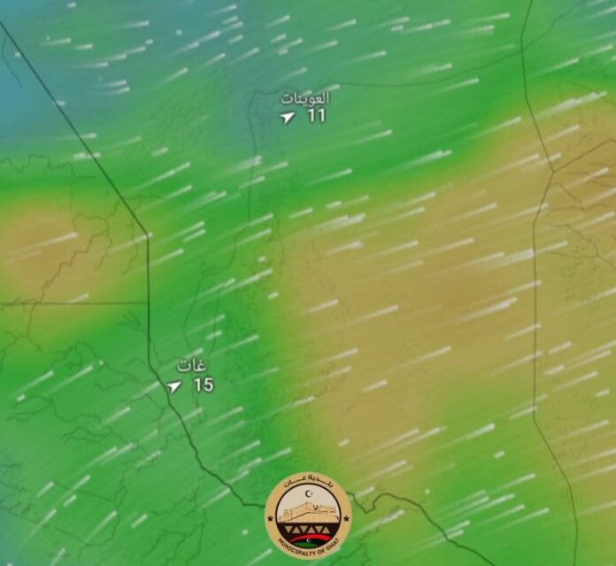 وبحسب البلدية، “تبدأ الرياح في التأثير على الأجواء ظهر الجمعة، حيث تصل سرعتها في غات والمناطق المجاورة إلى 40 كم/ساعة، مما يؤدي إلى إثارة الأتربة والغبار، يرافق ذلك ارتفاع في درجات الحرارة، حيث يُتوقع أن تسجل غات 37 درجة مئوية، وتبدأ سرعة الرياح في التراجع تدريجيًا مع دخول ساعات المساء”.